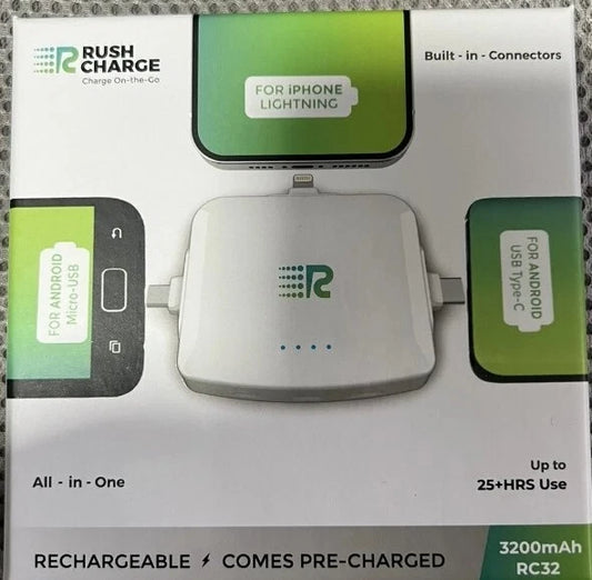 Rush Charge Portable Charger for iPhone & Android Devices 3200mAh USB C + Micro